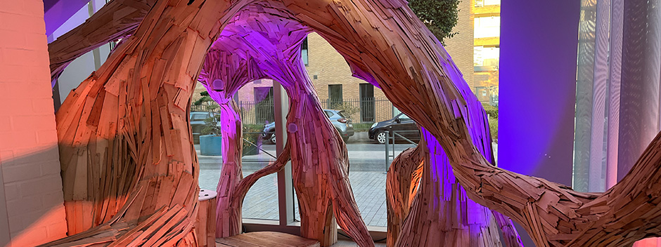 En 2025, l’équipe du Bateau Feu, accompagnée par les collectifs Artimuse et les Tisseurs d’ondes, a réalisé la sculpture « Le Rhizome ». Cette sculpture en palette recyclée a été créée pour le hall du Bateau Feu afin de mettre en avant les actions menées sur les notions de sobriété et de développement durable.