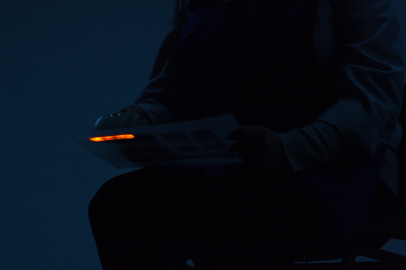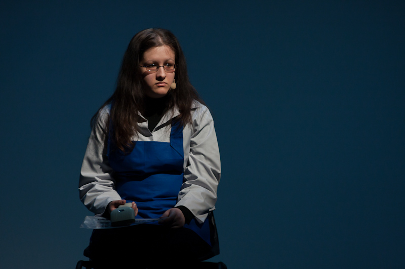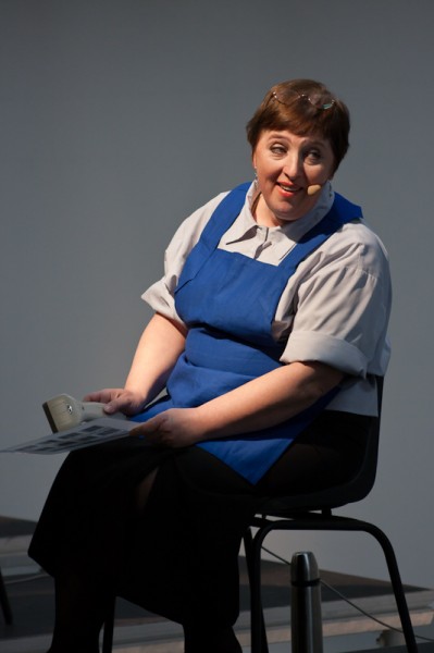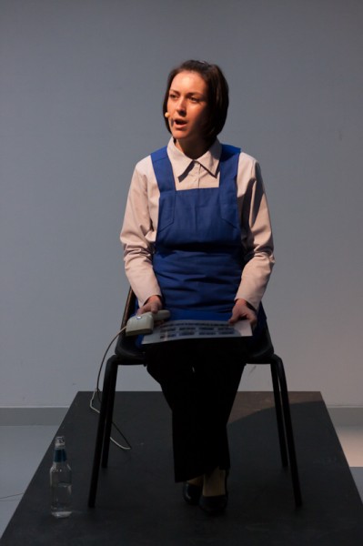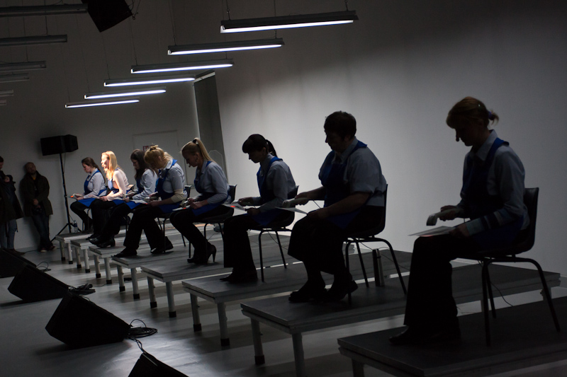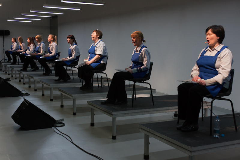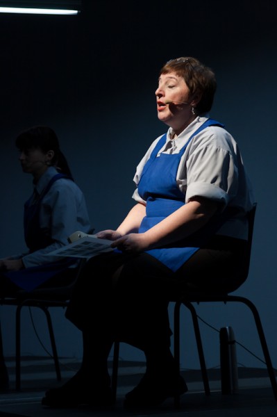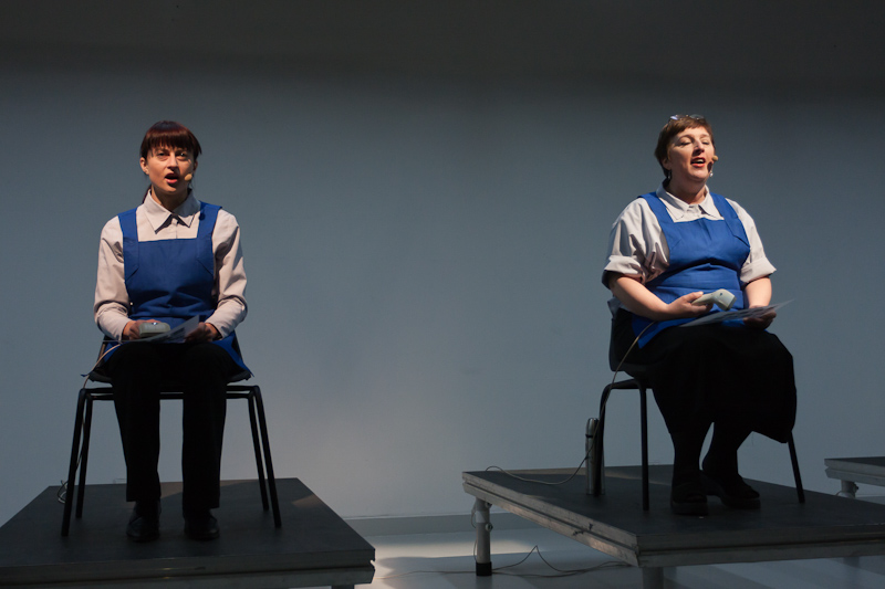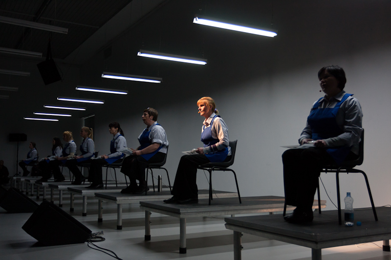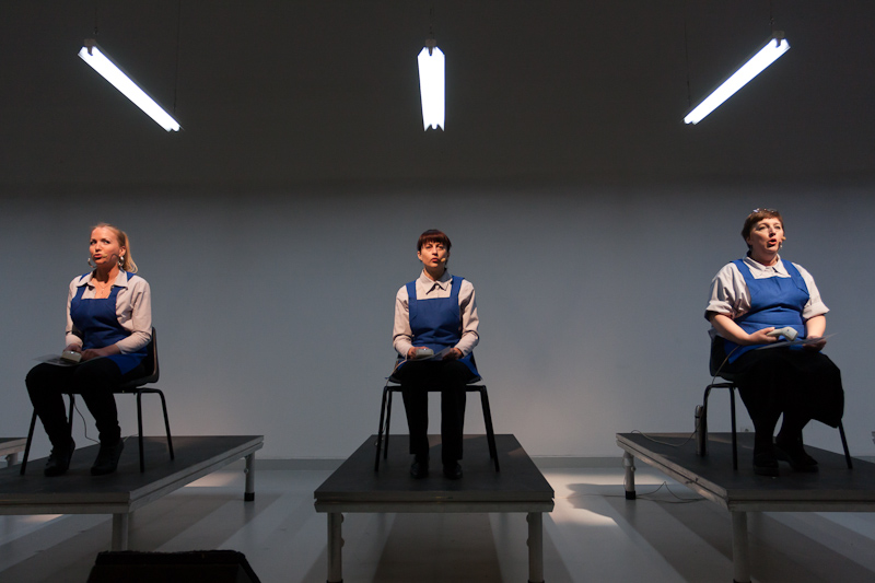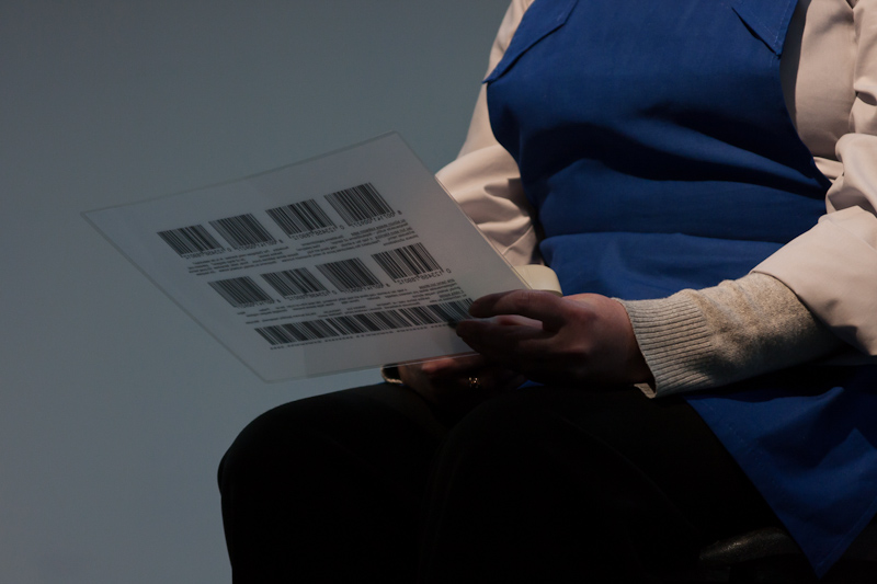 Dix femmes en tablier assises face au public : ce sont des caissières de supermarché. Elles chantent des phrases répétées mille fois par jour : « Bonjour, merci, bonne journée ».