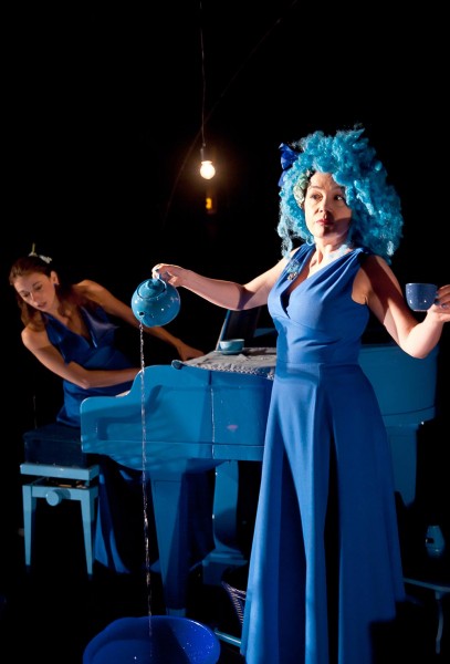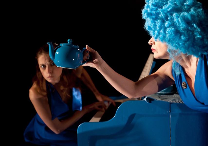 Dans Monsieur Bleu, tout est bleu ! Azurées de la tête aux pieds, la chanteuse lyrique Justine Curatolo et la pianiste Élisa Bellanger, accueillent les spectateurs dans leur petit bazar bleu.