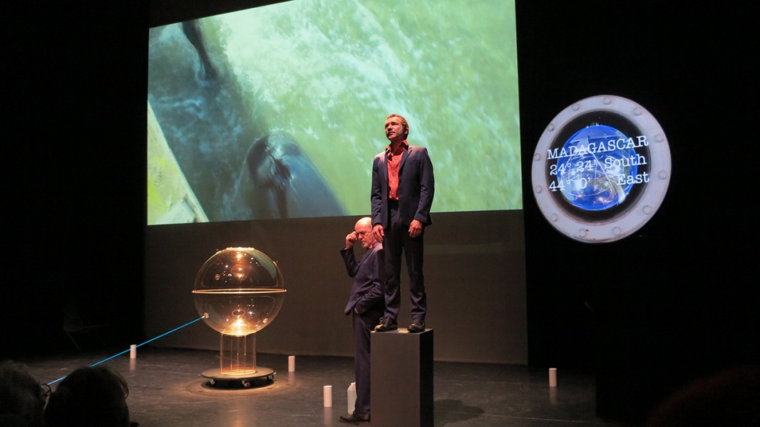 Saisir (Aganta) la chance (Kairos), c’est imaginer la trajectoire poétique de ces infimes particules pour mieux raconter notre monde sensible. Ainsi, la traque de ces messagers cosmiques en Méditerranée, en Antarctique, à Madagascar, au Groenland et en Nouvelle-Zélande est la trame de ce spectacle joyeux, conduit par deux guides un peu loufoques, les comédiens Jacques Bonnaffé et Didier Galas. bien connus des spectateurs du Bateau Feu. À leurs côtés, les solistes du chœur Spirito et les soixante choristes du Conservatoire de Dunkerque, dirigés par Nicole Corti et Xavier Fournier, interprètent la musique céleste de Samuel Sighicelli. Dans un continuum sonore composé de paroles, de chants et de sons électroniques, ce poème musical et visuel entrelace les sens et les sensations.
