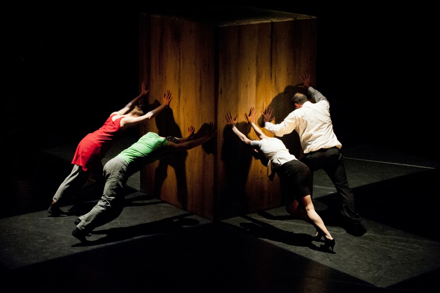 Un quatuor s'installe sur scène : deux musiciens s’accordent, deux danseurs s’échauffent. Les gestes sont fébriles, incertains… Et rien ne va se passer comme prévu ! À l'assaut d'une structure cubique inaccessible, stimulés par l'obstacle, les interprètes vont tour à tour se bousculer, danser, murmurer, s’énerver, jouer… Ils ne cesseront de chercher de nouveaux moyens pour aller toujours de l’avant.