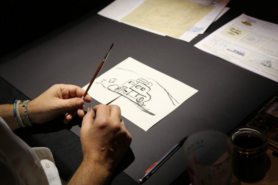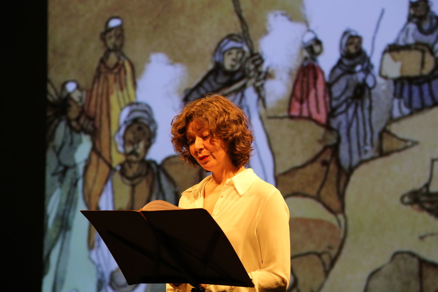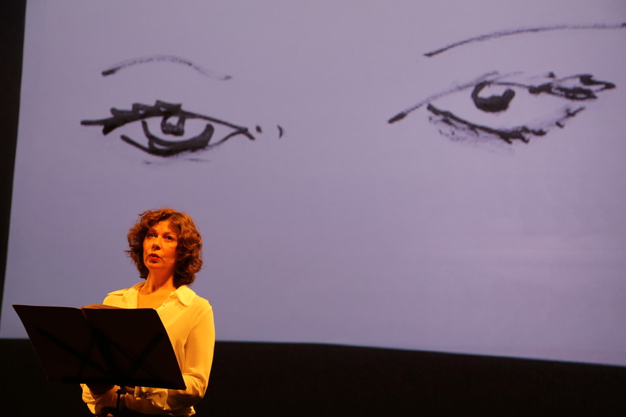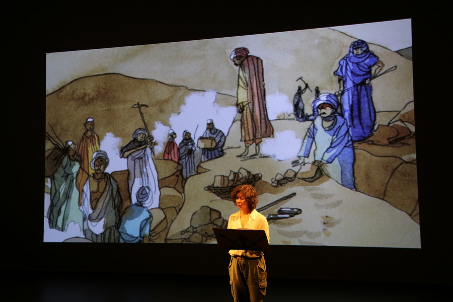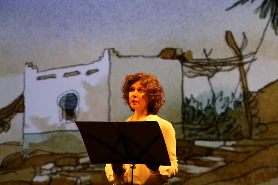 Sur le plateau, une comédienne lit ce texte méconnu, brillant et léger, tandis qu’un dessinateur fait vivre en direct les aventures d’Agatha à travers des croquis retransmis sur grand écran. Personnages, paysages, sites de fouilles, objets…, le dessin fait partager les trouvailles du voyage et crée le décor coloré de cette soirée si particulière.