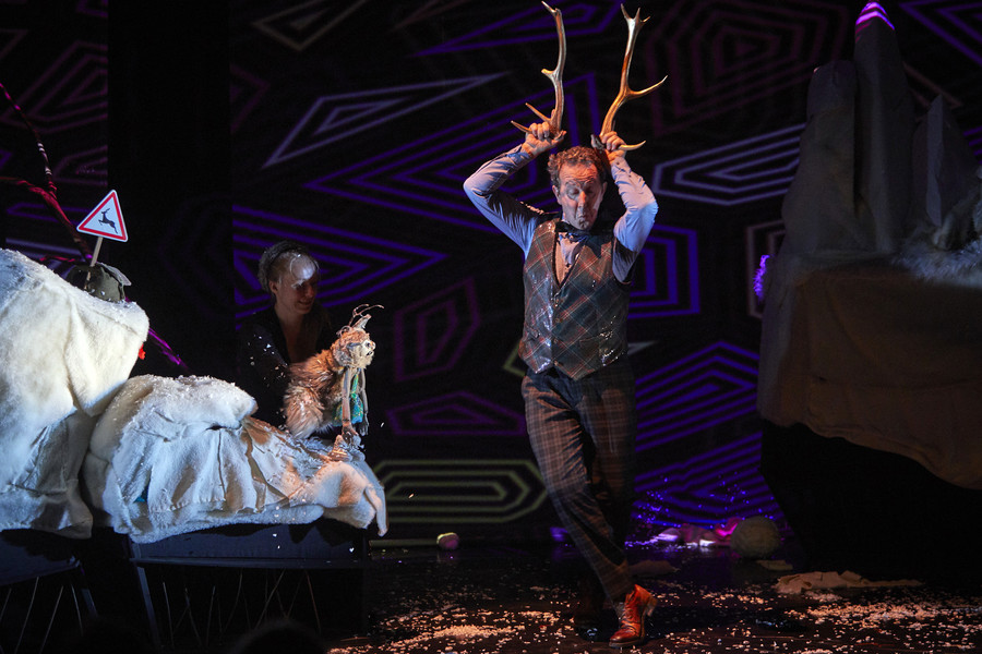 Dans ce spectacle, les enfants sont poilus, le père Noël est proche de la retraite et les chouettes semblent tout droit sorties d’une comédie musicale. Un conte initiatique narré par des acteurs et des marionnettes, où l’on veut décrocher la lune au premier coup de foudre, quitte à se brûler les ailes pour un inaccessible cerf… Les spectateurs sont intégrés au coeur de l’histoire, dans un dispositif scénique où ils sont au plus proche des émotions des personnages (et du spectacle). Une histoire qui s’adresse à tous pour le plaisir de poser des questions et partager nos chahuts intérieurs.