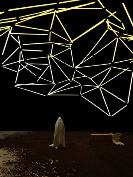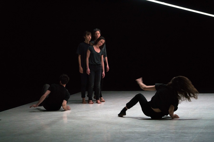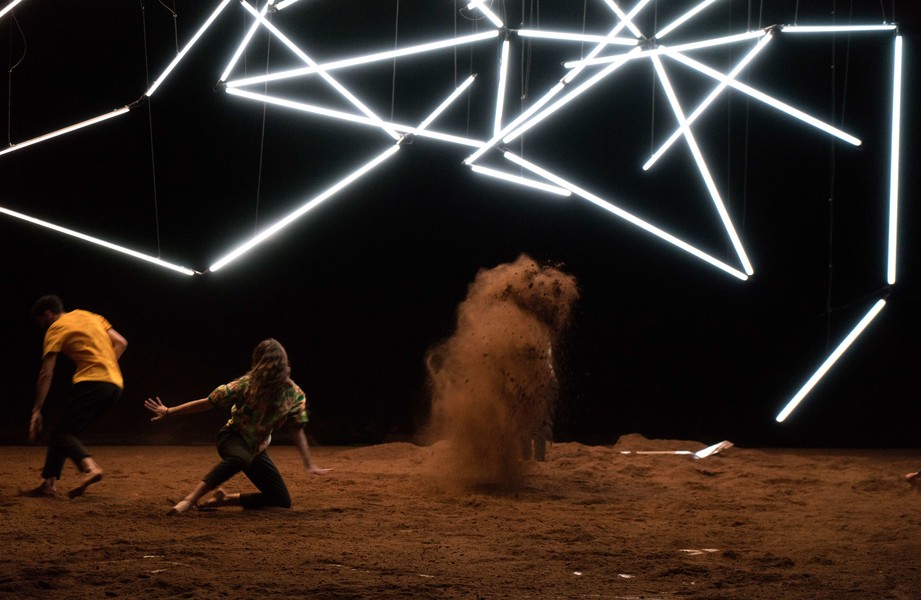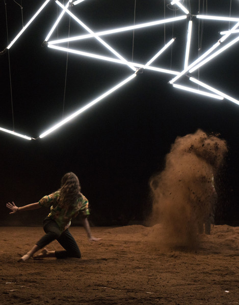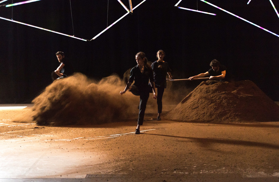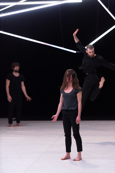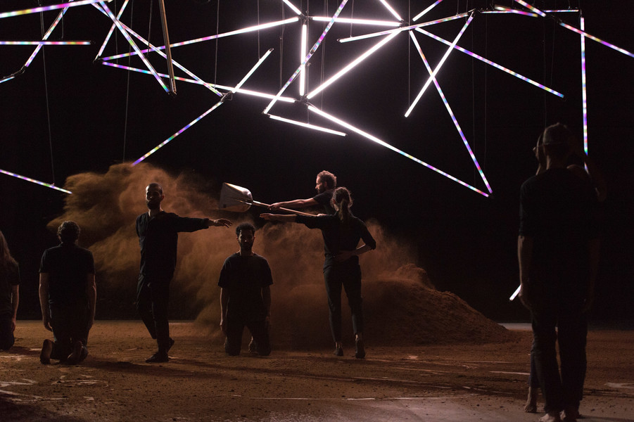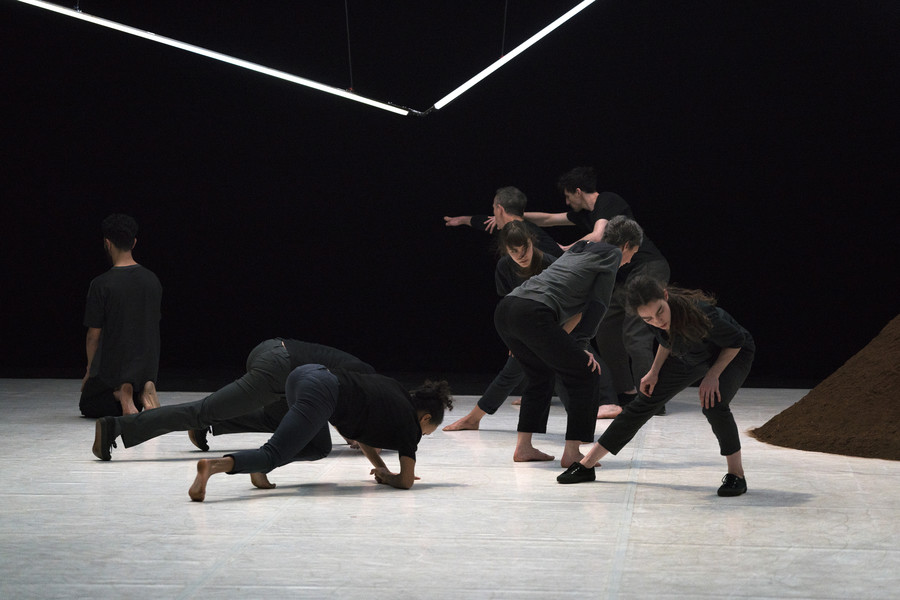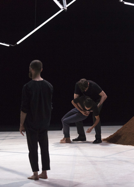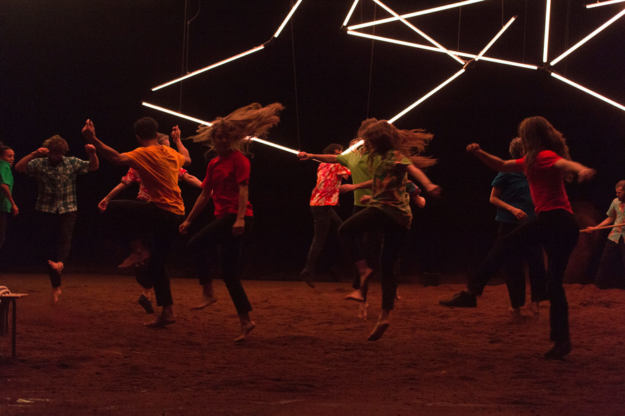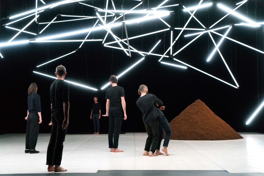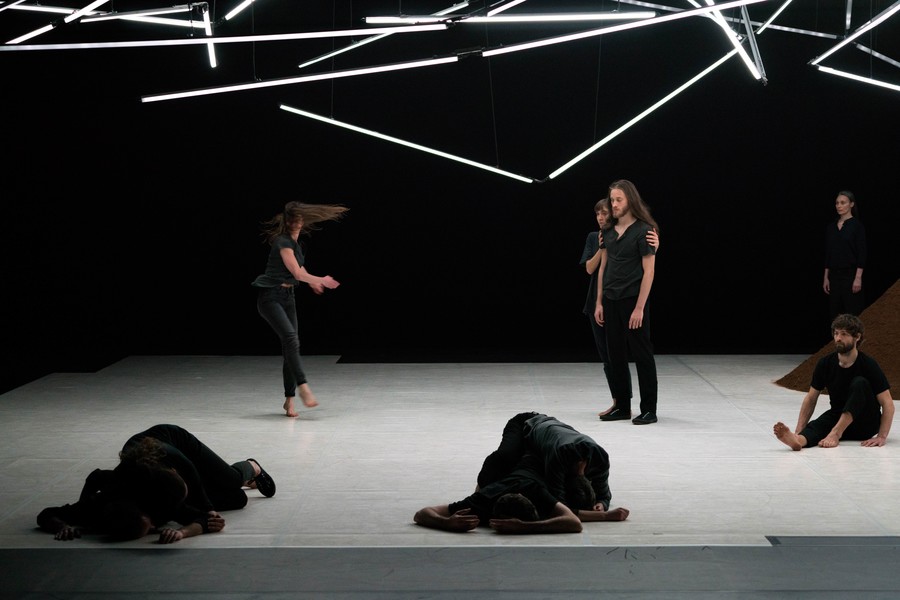 D’abord, il y a un vaste espace où se croisent quatorze interprètes d’une vitalité incandescente. Un sol blanc comme une page vierge, prêt à accueillir toutes les rencontres. Avec un toit en forme de structure lumineuse qui évolue en permanence avec son propre rythme, comme la musique de Pénélope Michel et Nicolas Devos, prégnante et enveloppante. Au fond, un monticule de terre énigmatique… Ce serait un peu comme une maison dont les murs invisibles abriteraient une multitude d’histoires se déroulant simultanément, à un, à deux, à trois, à quatre, ou à tous…