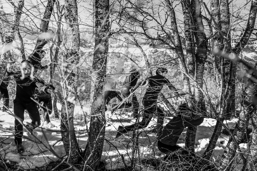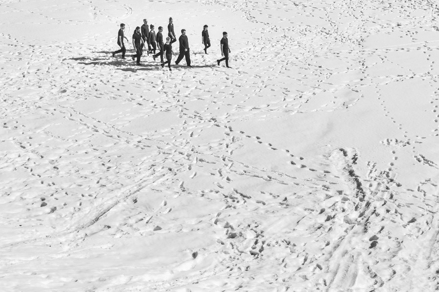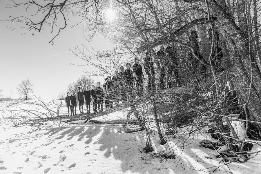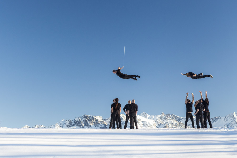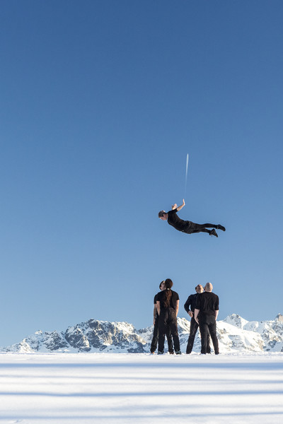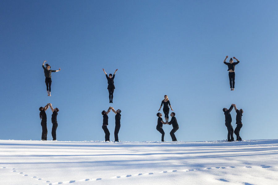 Les dix-neuf acrobates constituent un ensemble vivant en perpétuelle mutation, comme ces nuées d’étourneaux aux formes mouvantes qui emplissent parfois le ciel et obéissent à des phénomènes de coordination et de synchronisation qui nous dépassent. En élevant des constructions humaines fragiles, toujours plus hautes et spectaculaires, le groupe des XY se fait et se défait dans un mouvement permanent qui repousse toujours plus loin les limites de la gravité.