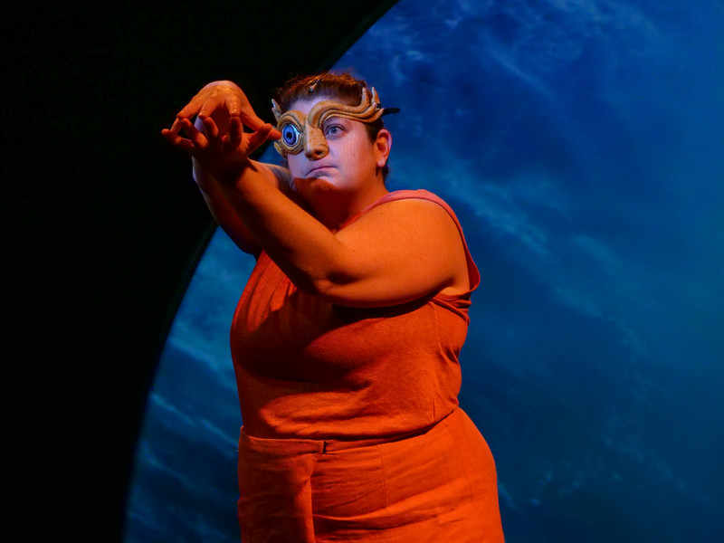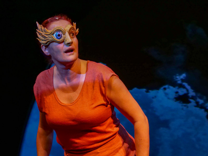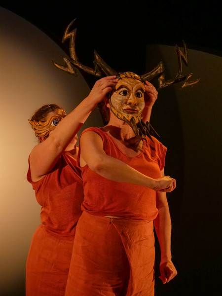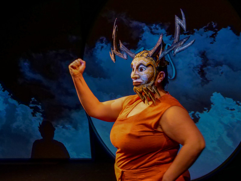 Avec deux comédiennes sourdes, Emmanuelle Laborit embarque le public dans ce monde onirique, rythmé par la langue des signes, les ombres, le théâtre d’objets, les masques et la marionnette. La pièce prend son sens à travers le geste et l’image. Les mots se transforment en une écriture visuelle, les paroles en signes. Certains mots sont projetés sur la toile, comme des indices, construisant ainsi un puzzle sous les yeux et dans l’esprit du spectateur. Un spectacle joyeux qui s’adresse à tous, petits et grands, signants et non-signants, spécialistes de la mythologie ou tout à fait néophytes.