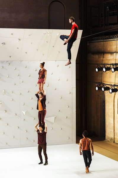 Rachid Ouramdane magnifie la rencontre entre huit acrobates experts en voltige et deux athlètes aventuriers du ciel : la grimpeuse Ann Raber Cocheril et le highliner Nathan Paulin. Face au mur d’escalade qui surplombe la scène, tous affrontent la gravité tandis qu’un environnement vidéo témoigne des incroyables paysages dans lesquels évolue cette communauté du monde aérien.