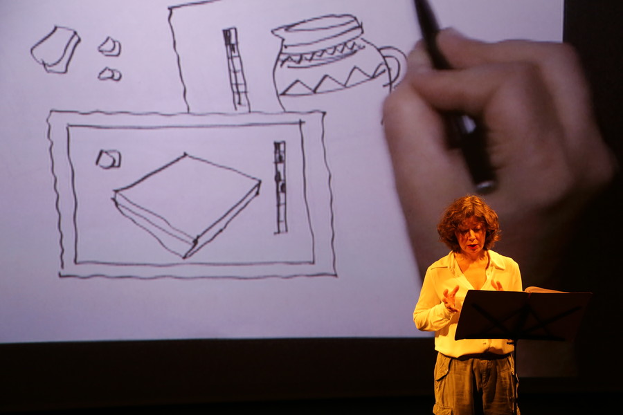 Sur le plateau, une comédienne lit ce texte méconnu, brillant et léger, tandis qu’un dessinateur fait vivre en direct les aventures d’Agatha à travers des croquis retransmis sur grand écran. Personnages, paysages, sites de fouilles, objets…, le dessin fait partager les trouvailles du voyage et crée le décor coloré de cette soirée si particulière.