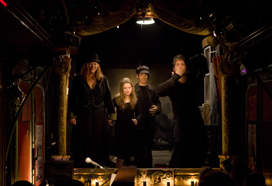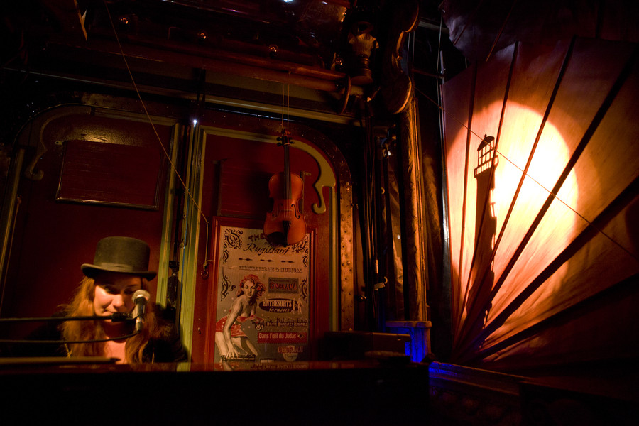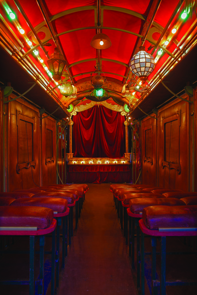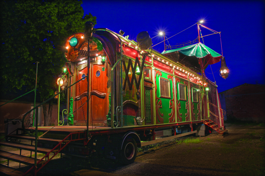 Dans l’esprit des entresorts forains, le public est invité à entrer dans une magnifique roulotte parée de lampes et agrémentée d’une véritable lanterne de phare qui, la nuit, balaye la ville de ses rayons.
