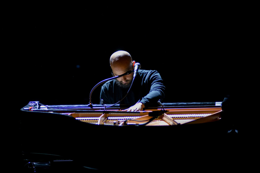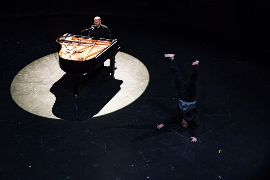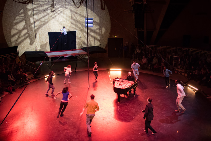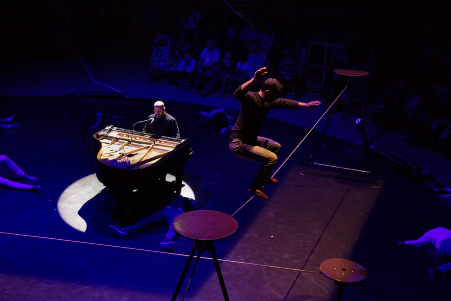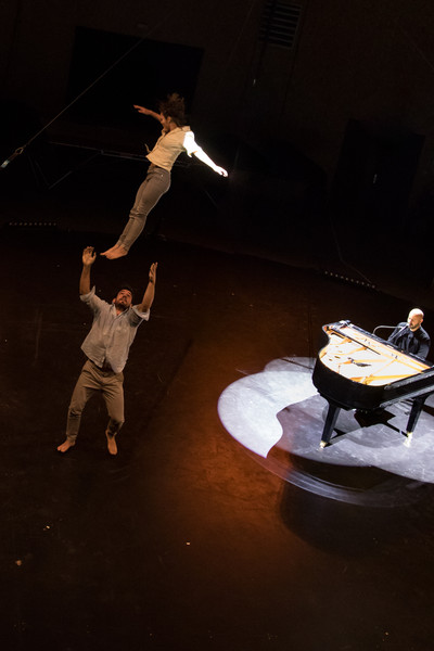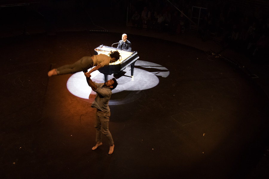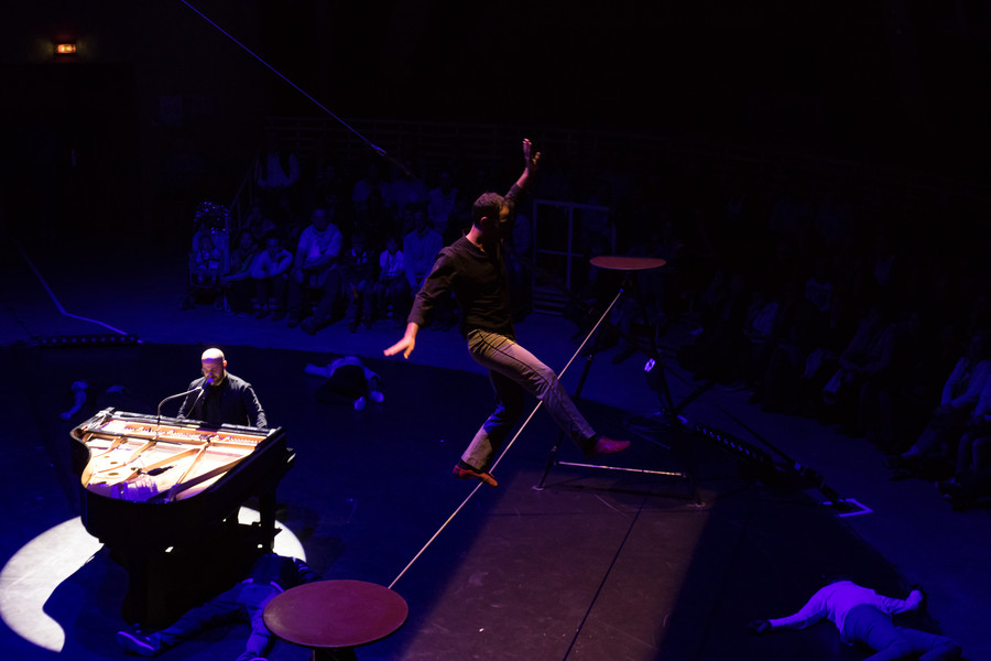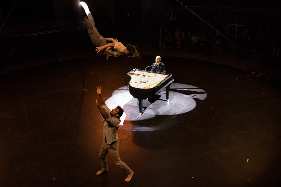 Assis au piano au centre du plateau, Bachar Mar Khalifé livre des compositions à la fois intimes et ouvertes à l’autre, entre musique arabe traditionnelle, électro et jazz… Quand ses doigts voltigent sur le piano, il se lance dans un étonnant dialogue entre l’instrument et le geste. En réponse à ses envolées lyriques, six circassiens évoluent au plus près du pianiste et rebondissent sur sa partition en faisant écho à la sensualité des paroles murmurées, en épousant la fragilité des mélodies, en décuplant l’énergie des rythmes.