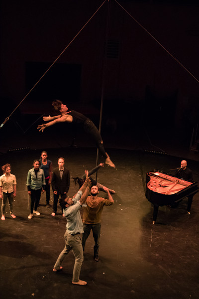 Fort de toute la richesse des arts du cirque, acrobatie, mât chinois, trampoline et danse, Gaëtan Levêque construit des tableaux intenses. Avec l’envie de mettre du corps sur les notes, de trouver l’impulsion juste, de rendre la prouesse circassienne aussi délicate que la voix, d’écrire un voyage commun, les circassiens dialoguent avec le musicien dans une parfaite complicité. De la poésie à l’état pur !