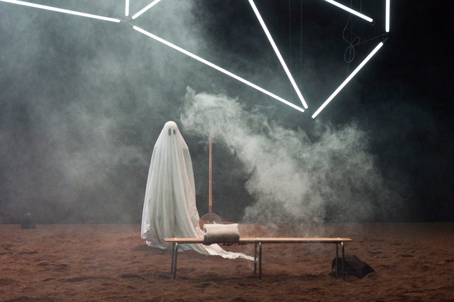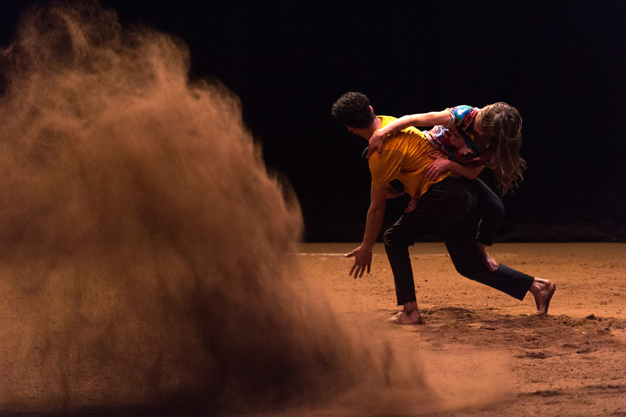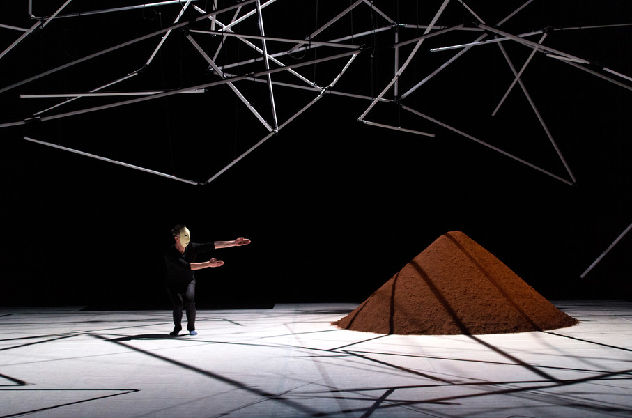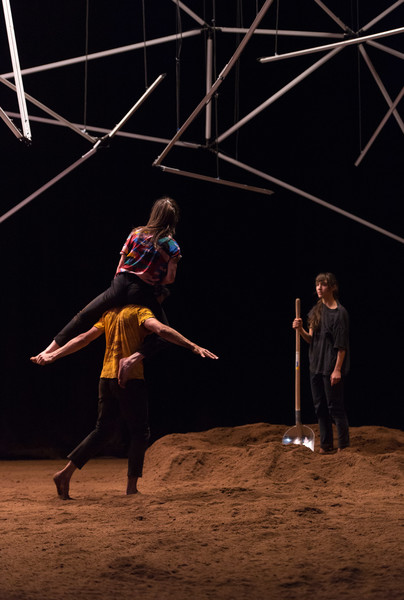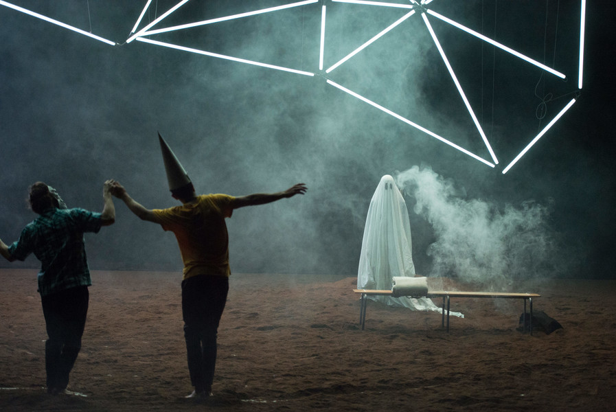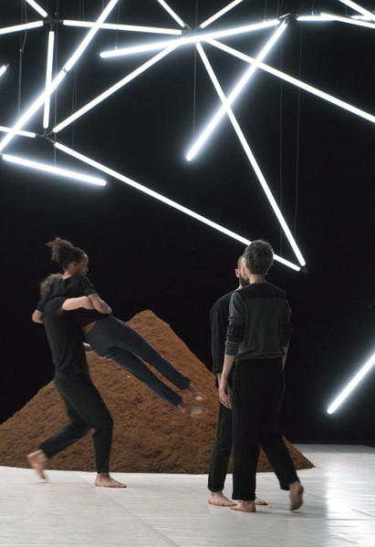D’abord, il y a un vaste espace où se croisent quatorze interprètes d’une vitalité incandescente. Un sol blanc comme une page vierge, prêt à accueillir toutes les rencontres. Avec un toit en forme de structure lumineuse qui évolue en permanence avec son propre rythme, comme la musique de Pénélope Michel et Nicolas Devos, prégnante et enveloppante. Au fond, un monticule de terre énigmatique… Ce serait un peu comme une maison dont les murs invisibles abriteraient une multitude d’histoires se déroulant simultanément, à un, à deux, à trois, à quatre, ou à tous…