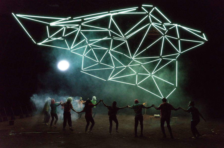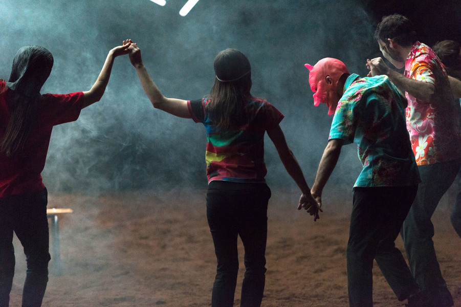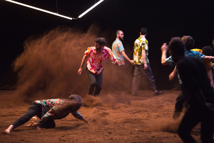 Dans cette « maison de la danse », Christian Rizzo convie des hommes et des femmes de tous âges et traverse la question du collectif face aux solitudes. Cette belle communauté humaine, corps commun protéiforme, se nourrit des arrivées des uns et des départs des autres, dans un flux continu de mouvements où les errances solitaires sont contredites par de joyeuses bousculades. Plus tard, le spectacle prend une tout autre dimension : le plateau devient forestier, les vêtements passent progressivement du noir à la couleur, de grands chapeaux pointus et d’étranges masques couvrent les têtes et les visages. Dans ce carnaval fantastique, entre Goya et Ensor, on se prend les mains pour une émouvante farandole jusqu’à la surnaturelle apparition finale. Un chef-d’œuvre plastique et chorégraphique !