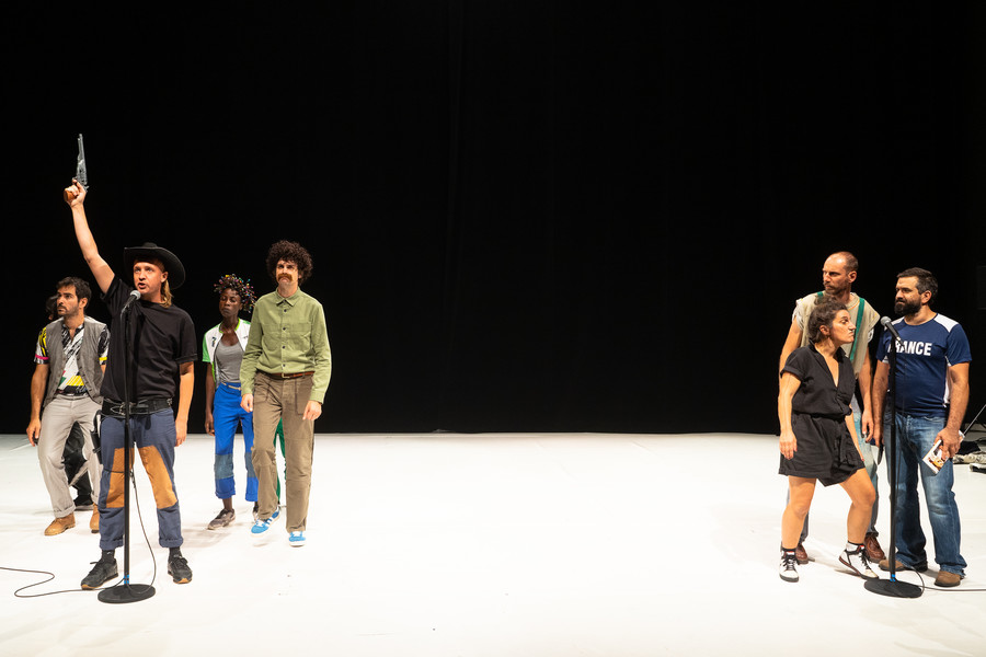 Faillir être flingué se trouve être le récit d’une communauté solidaire par nécessité, joyeuse, festive, travailleuse et non dogmatique. En adaptant pour la scène le texte de Céline Minard (prix du Livre Inter 2014), Guillaume Bailliart propose une sorte de récital avec des cascades, des poursuites à cheval d’arçons, des vraies bagarres, du vent violent, des épreuves physiques pour ceux qui jouent. Comme au cinéma, en quelque sorte !