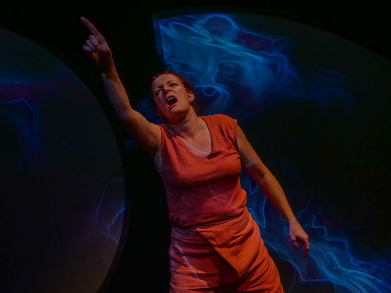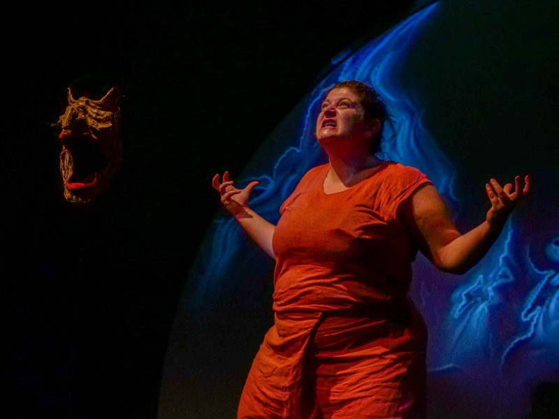 Avec deux comédiennes sourdes, Emmanuelle Laborit embarque le public dans ce monde onirique, rythmé par la langue des signes, les ombres, le théâtre d’objets, les masques et la marionnette. La pièce prend son sens à travers le geste et l’image. Les mots se transforment en une écriture visuelle, les paroles en signes. Certains mots sont projetés sur la toile, comme des indices, construisant ainsi un puzzle sous les yeux et dans l’esprit du spectateur. Un spectacle joyeux qui s’adresse à tous, petits et grands, signants et non-signants, spécialistes de la mythologie ou tout à fait néophytes.