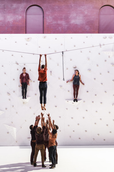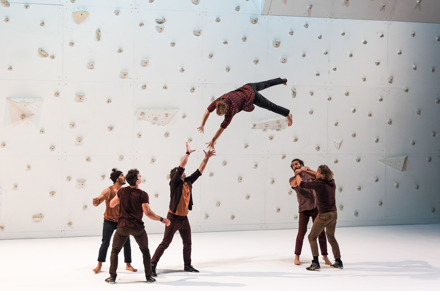 Rachid Ouramdane magnifie la rencontre entre huit acrobates experts en voltige et deux athlètes aventuriers du ciel : la grimpeuse Ann Raber Cocheril et le highliner Nathan Paulin. Face au mur d’escalade qui surplombe la scène, tous affrontent la gravité tandis qu’un environnement vidéo témoigne des incroyables paysages dans lesquels évolue cette communauté du monde aérien.