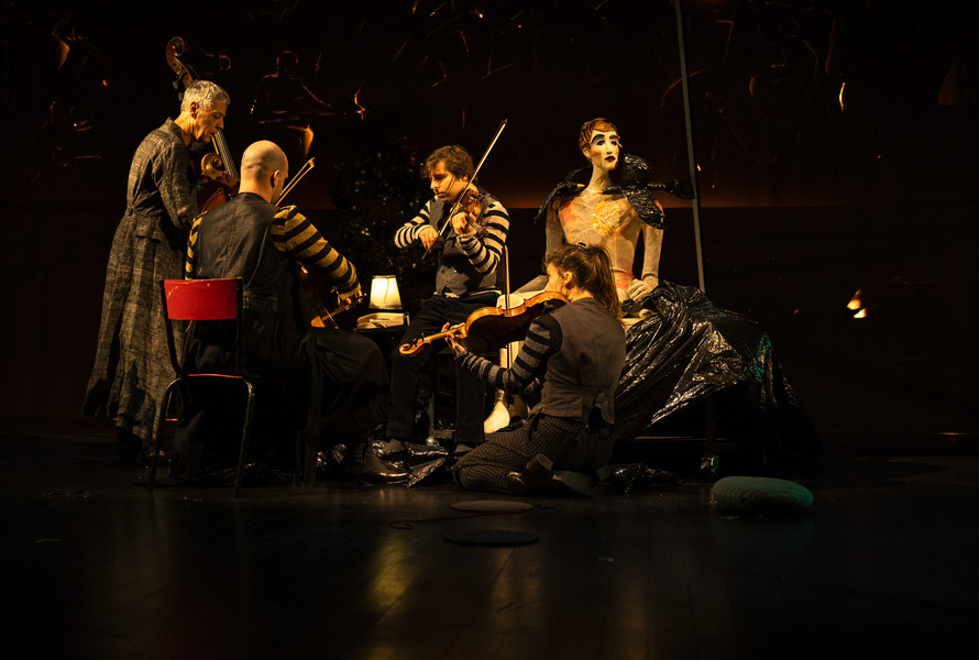 mise en scène Brice Berthoud avec Marie Girardin | marionnettistes en déséquilibre Camille Trouvé, Jonas Coutancier | créateurs d’images et de lettres en direct Amélie Madeline en alternance avec Vincent Croguennec | l’homme échelle Philippe Desmulie | dramaturgie Saskia Berthod | composition musicale Jean-Philippe Viret | quatuor à cordes Jean-Philippe Viret (contrebasse), Mathias Lévy (violon), Maëlle Desbrosses (alto), Bruno Ducret (violoncelle) | scénographie Brice Berthoud avec Adèle Romieu | création et construction marionnettes Camille Trouvé, Jonas Coutancier, Amélie Madeline, Séverine Thiébault, Caroline Dubuisson | création costumes Séverine Thiébault | création sonore Antoine Gary avec Tania Volke | création lumière Brice Berthoud avec Louis De Pasquale