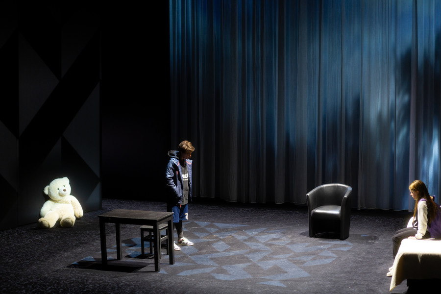 création théâtrale Joël Pommerat | avec Éric Feldman, Coraline Kerléo, Marie Malaquias | avec les voix de David Charier, Delfine Huot, Roxane Isnard, Pierre Sorais et Faustine Zanardo | scénographie et lumière Éric Soyer | création vidéo Renaud Rubiano | costumes Isabelle Deffin | perruques Julie Poulain | création sonore Philippe Perrin, Antoine Bourgain | musique originale Antonin Leymarie | collaboration artistique Garance Rivoal | assistanat à la mise en scène David Charier | renfort assistanat Roxane Isnard | collaboration à l’écriture Zareen Benarfa | comédien, participation au travail de recherche Pierre Sorais | direction technique Emmanuel Abate | direction technique adjointe Thaïs Morel | régie son Antoine Bourgain | régie vidéo Grégoire Chomel | régie lumière Gwendal Malard | régie plateau Pierre-Yves Le Borgne, Inês Correia Da Silva Mota | habillage Lise Crétiaux | réalisation maquette et accessoires Claire Saint-Blancat | construction accessoires Christian Bernou | renfort costumes Jeanne Chestier | renforts plateau Lior Hayoun, Faustine Zanardo | remerciements à Maurine Tainguy et Rose Trecan