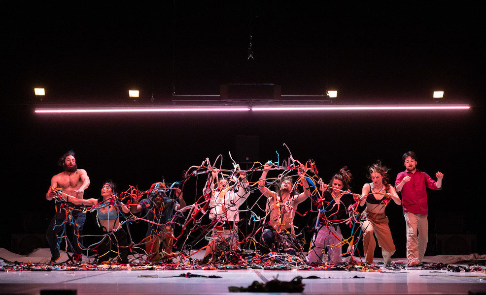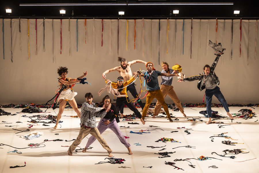 D’abord huit silhouettes, étranges sculptures qui se mettent petit à petit en mouvement. Quatre femmes et quatre hommes, danseurs contemporains, de hip-hop ou de krump, tentent de faire société. Sur une puissante bande sonore, ils se lancent dans une série de danses collectives, disloquées et effrénées. Le groupe finit par construire une étonnante structure de morceaux de tissu multicolores. Le chorégraphe Bruno Pradet signe une œuvre passionnante, vivante et colorée.