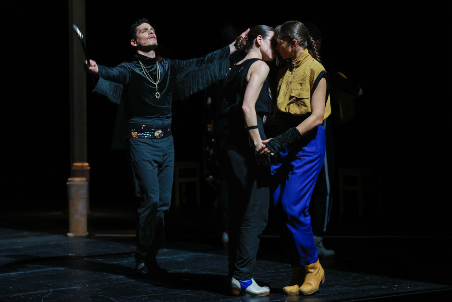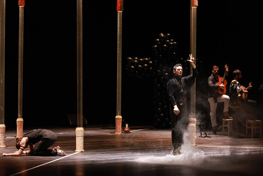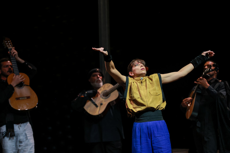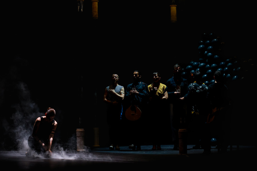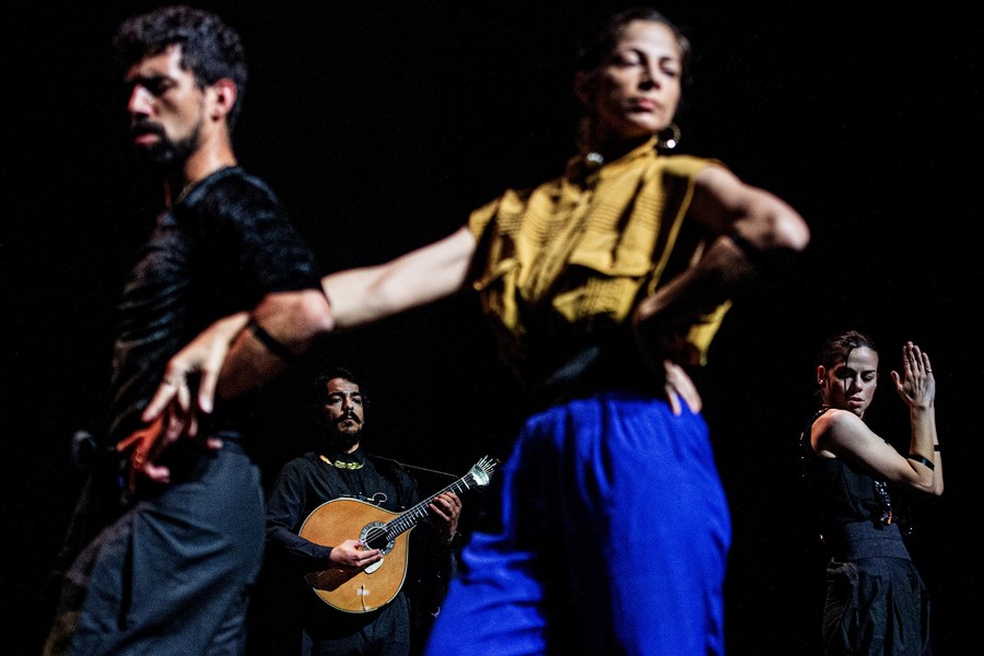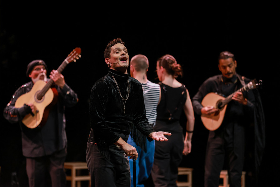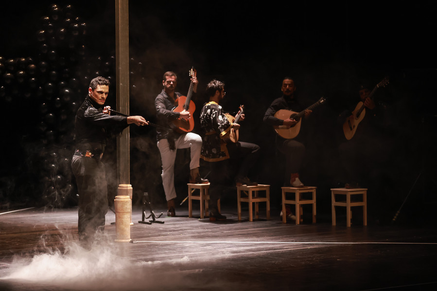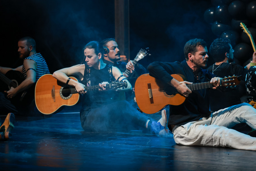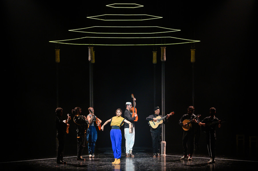 Cinq danseurs, quatre musiciens et un chanteur à la voix déchirante réinventent les danses généreuses que le fado a perdues au fil du temps. Dans ce ballet énergique et virtuose, sur des guitares endiablées, les bottines à claquettes des interprètes martèlent le sol en variant les rythmes. Dans ce dialogue constant entre la danse et la musique, les artistes subliment leur art en totale liberté jusqu’à une surprenante scène finale carnavalesque. Véritable traversée sensuelle, Bate Fado est une véritable fête musicale et chorégraphique…